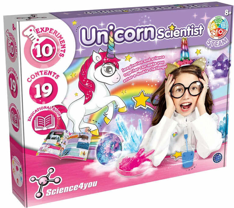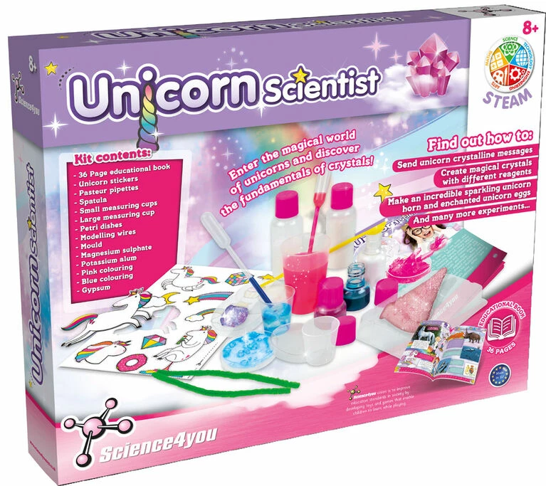 Find out how to: Send unicorn crystalline messages, Create magical crystals with different reagents, Make an incredible sparkling unicorn horn and enchanted unicorn eggs and many more experiments… Kit contents: 36 Page educational book, Unicorn stickers, Pasteur pipettes, Spatula, Small measuring cups, Large measuring cup, Petri dishes, Modelling wires, Mould, Magnesium sulphate, Potassium alum, Pink colouring, Blue colouring and Gypsum. Science4you is more than just a Science Experiment it’s an Educational Experience. We strive to find the balance between Education and Fun. Watch your child’s eyes light up as they complete their experiments and help them develop a love for Science. Each kit comes with a booklet Written by real Scientists to help educate your child with basic science, history and background information on its experiments. Science4You kits are made in Portugal and tested using strict European standards. Science4You kits are proven to Boost your Child’s Brainpower! Motor Skills, Social Skills, Learning, Concentration and Creativity