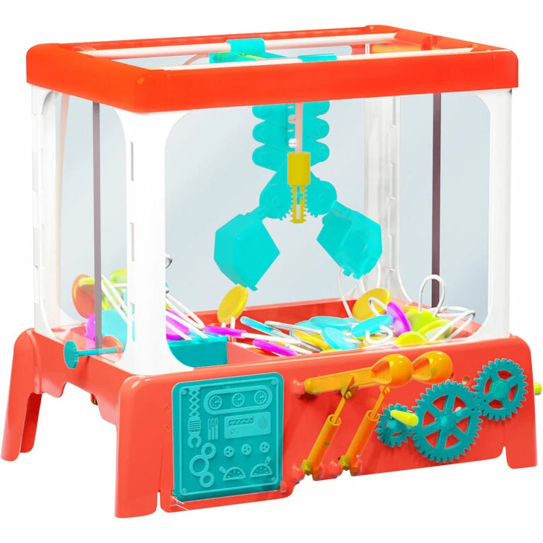 Step right up and try your luck! Do you have what it takes to grab a claw-full of candy with the Candy Claw Machine? Experiment to develop your motor skills and engineering chops to conquer this awesome STEM challenge. Build a working model of the classic claw machine – that enticing, sometimes frustrating, and always fun arcade game in which you try to grab prizes from inside the machine with a remote-controlled claw in a limited amount of time. Cranks, gears, and belts move the claw arm left and right, and forward and back. Hydraulic levers move the arm up and down, and open and close the claw. A spring-loaded trap door shoots the collected candy out at you if you manage to succeed. Time yourself or your friends and see if you can retrieve a specific object in a given amount of time. No batteries or electricity are required – it uses only the power of your hand and the mechanical advantage of the machines built into the device. Choose from three different claw shapes (cool nerdy roboticists call these “end effectors”) and find the one that works best to pick up a particular candy or prize. Learn how the gears, levers, belt, screws, hydraulics, linkages, cranks, and claws all work together to pick up, move, and drop prizes. Experiment with different gear ratios to speed up or power up your claw. Packed with 10 lollipops (Saf-T-Pops) and decoys (fake candy boxes), you can also fill it with whatever small candies, toys, or other small objects you like. The game itself is great for honing dexterity skills and hand-eye coordination. An innovative take on a robotic arm with something really worth grabbing! + Build your own arcade-style claw machine that grabs lollipops and decoy candy boxes (both included). + Experiment with three different types of claws (pincher, scoop, and three-pronged). + Learn about hydraulics, levers, gears, belts, linkages, end effectors, and more. + Fun, gamified approach to engineering lessons with a sweet candy reward + Refill your machine with your own treats and prizes for long-lasting fun.