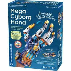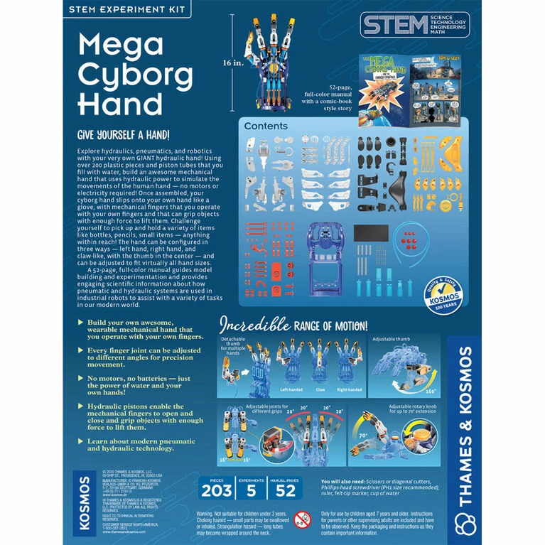 Explore hydraulics, pneumatics, and robotics with your very own GIANT hydraulic hand! Using over 200 plastic pieces and piston tubes that you fill with water, build an awesome mechanical hand that uses hydraulic power to simulate the movements of the human hand–no motors or electricity required! Once assembled, your cyborg hand slips onto your own hand like a glove, with mechanical fingers that you operate with your own fingers and that can grip objects with enough force to lift them. Challenge yourself to pick up and hold a variety of items like bottles, pencils, small items–anything with reach! The hand can be configured in three ways–left hand, right hand, and claw-like, with the thumb in the center–and can be adjusted to fit virtually all hand sizes.A 40-page, full-color manual guides model building and experimentation and provides engaging scientific information about how pneumatic and hydraulic systems are used in industrial robots to assist with a variety of tasks in our modern world.