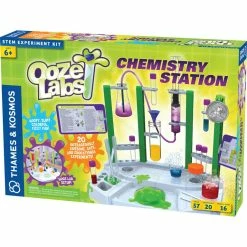 Grab your beakers and test tubes and step up to your special laboratory station for some exciting chemistry experiments. See how much fun chemistry can be as you do slimy, fizzy, colorful, and bubbly experiments. This cool laboratory setup has lots of different vessels and pieces of lab equipment so kids can play the role of chemist while doing real, safe experiments. All of the experiments use non-hazardous chemicals. This playful introduction to the basics of chemistry includes approximately 20 experiments. The experiments are presented on printed cards that can be clipped onto the lab station for easy reference. Experiments include glowing slime, color-changing slime, fizzing reactions, oozing bubbles, rainbow in a test tube, chromatography, cabbage juice pH tests, solutions, filtering, crystals, fire extinguisher, and underwater volcano. The kit includes a large plastic chemistry station, experiment cards, various vessels in different sizes, syringe, measuring cup, pipette, spatula, tube, petri dish, funnel, non-hazardous chemicals for the experiments, and experiment manual.