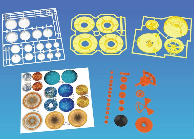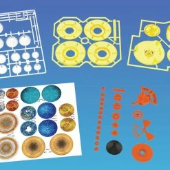 Set the planets in motion with a flick of your wrist! Build a mechanical model of the solar system including the sun and eight planets (also known as an orrery), wind it up, and watch the planets revolve around the sun. Assemble this complex machine using snap-together plastic parts to learn how the gears and wind-up mechanism work to spin the model. Detail each planet with colorful, realistic-looking printed planet graphics. Discover how a special type of gear called a planetary gear is used to simulate the mesmerizing motion of the solar system. Learn about the order of the planets, their relative sizes, their rates of revolution around the sun, their appearance, and other planetary facts. Bonus: There’s a built-in expansion slot in case the mysterious Planet Nine is discovered! This kit includes full-color step-by-step illustrated assembly instructions. + Build a colorful model of the solar system. + Wind-up engine sets your planets in motion around the sun – no batteries required + Learn about the planets’ celestial orbits. + Explore fundamental gear mechanics; planets travel at different speeds depending on the gear ratio.