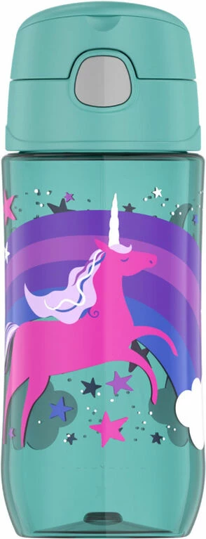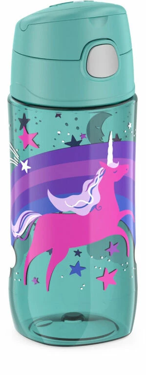 The THERMOS FUNTAINER 16oz hydration bottle is ready to go on little adventures. Help keep germs away with the hygienic covered spout. To clean, you can put your FUNtainer water bottle in the dishwasher; however, hand washing is recommended. Do not use with hot liquids.
