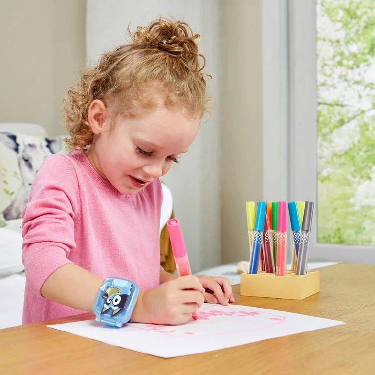Let’s play with Bluey, Bingo and the Wackadoo Watch! This wristwatch for kids featuring Bluey includes eight digital clock faces, time tools and four games. Hear the voices of Bluey and Bingo guide you through games that include characters from the show. Bandit has wound Bingo up like a wind-up toy! Press the left and right buttons to help Bingo avoid obstacles that appear in the classroom. Bluey wants to play a game of keepy-uppy! Help Bluey keep a balloon off the ground by using the left and right buttons. At Hammerbarn, Bluey wants to buy the same thing as Bingo. Match an object with its shadow to find a matching item. See Bingo hide her plush bunny Floppy into one of three chickenrat eggs and mix them up. Watch carefully and choose the egg where Floppy is hidden. Time tools include a stopwatch, timer and alarm. Wackadoo! Intended for ages 3-6 years. Requires 1 CR2450 lithium coin battery. Battery included for demo purposes only. New battery recommended for regular use.