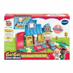 Don’t just watch CoComelon, live it! Get your child’s imagination going with a playhouse that looks like JJ’s home. Hop in the family car with JJ and zoom around the house on the easy-to-connect closed-track system. Attach the wagon to give Bingo and Pickles a ride. Driving around the track set, little ones practice motor skills while triggering cause-and-effect activities. What happens when they drive over the SmartPoint pictures? Kiddos will hear songs, sounds and phrases that reinforce words they’re learning. Give JJ a pat on the head to hear his voice and sing-along songs from the show, like how to be kind to friends and have good manners. Head back to the house and open the front door to see Mom look out the window. Cody’s there too! Immerse little ones in a world of pretend play! Collect JJ’s Tractor and Track or Cody’s Bus and Track (each sold separately) and play together with family and friends. Have a good day! Intended for ages 1.5+ years. Requires 2 AAA batteries. Batteries included for demo purposes only. New batteries recommended for regular use.