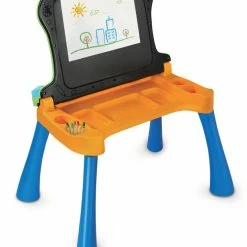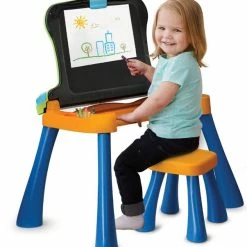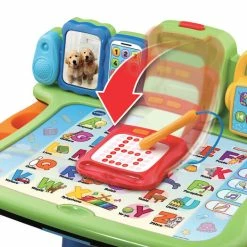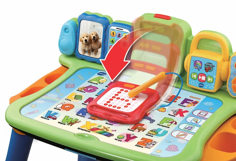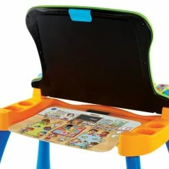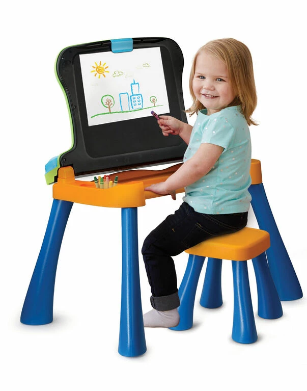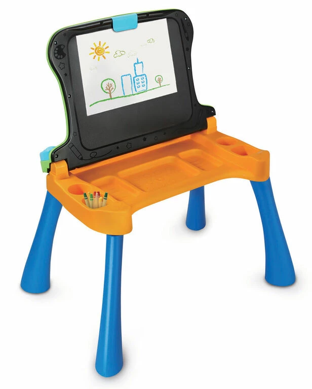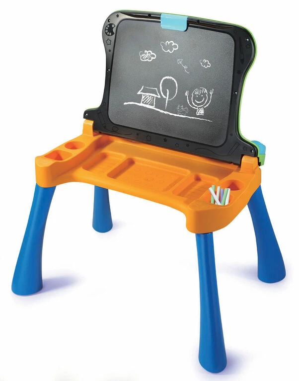 Learn and create with the Explore and Write Activity Desk! This interactive desk features five activity pages filled with engaging content including letters, numbers, music, colors and more. The fold-down writing pad and light-up display encourage kids to practice writing by tracing letters, numbers and shapes with a stylus. The desk transforms into an easel and chalkboard with plenty of storage space for art supplies. Continue the play with expansion packs that each focus on a specific curriculum like nursery rhymes, reading skills, animals and numbers. Kids can also play with the touchscreen toy phone or listen to more than 20 melodies on the music player. (Art supplies not included. Expansion packs sold separately.) Intended for ages 2-5 years. Maximum weight 75 pounds. Requires 4 AA batteries. Batteries included for demo purposes only. New batteries recommended for regular use.