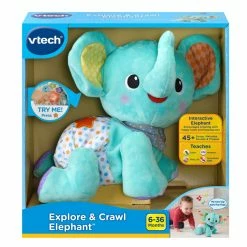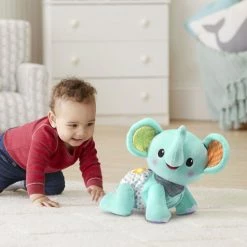 It’s time to explore! The cheerful Explore & Crawl Elephant encourages little ones to crawl and walk after him with ears that flap and a bright, light-up star. This soft, plush animal invites cuddles while providing lots of sensory stimulation with multiple textures and bright patterns. Kids build their gross motor skills as they practice crawling and walking after the elephant. Babies and toddlers can press any button to get the elephant moving, making playtime easy and rewarding. The elephant asks children to identify colors and numbers by pressing buttons. Watch the elephant crawl, sing and flap his ears in response! 45+ songs, melodies, sounds and phrases enliven playtime while teaching about colors, numbers and daily life. Intended for ages 6-36 months. Requires 3 AA batteries. Batteries included for demo purposes only. New batteries recommended for regular use.