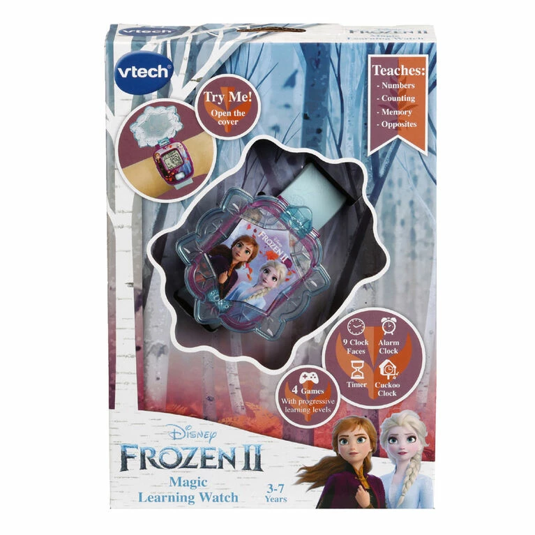 The VTech® Frozen II Magic Learning Watch is a great wearable gadget for children! Not only will this watch show you the time, there is also an alarm, timer & stopwatch functions. There are 4 built-in games to introduce and reinforce the learning of counting, opposites, numbers and problem solving! Remember Olaf’s pose, see the objects Elsa creates with her magic and discover their opposites, count the boulders or choose the correct numbers to guide Olaf across the river! Includes 9 interchangeable digital clock faces and glowing light! It’s time to join the adventure with Anna, Elsa and their friends!