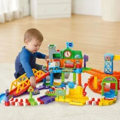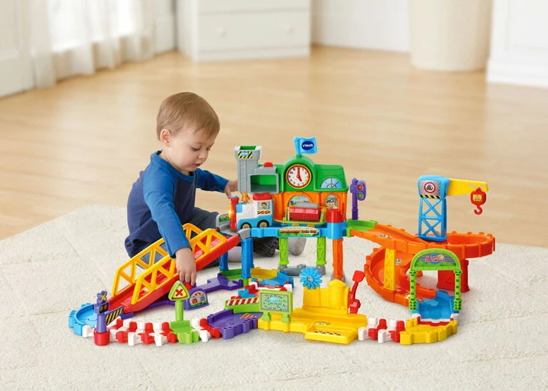 All aboard for loads of fun with the Go! Go! Smart Wheels Roadmaster Train Set. There are so many ways to play! Bendable tracks allow multiple configurations, and four SmartPoint locations and mechanical switches keep kids engaged. Choo-choo along with the motorized Freight Train with the detachable cargo car to haul the water drum from the station. Franklin the Freight Train powers himself up and down the ramp and the teeter totter bridge for multilevel play. Lift the cargo basket with the water drum once Franklin reaches the crane, then send the train back to the water depot. Enjoy trainmaster, role-play fun! Intended for ages 1-5 years. Requires 3 AAA batteries. Batteries included for demo purposes only, new batteries recommended for regular use.