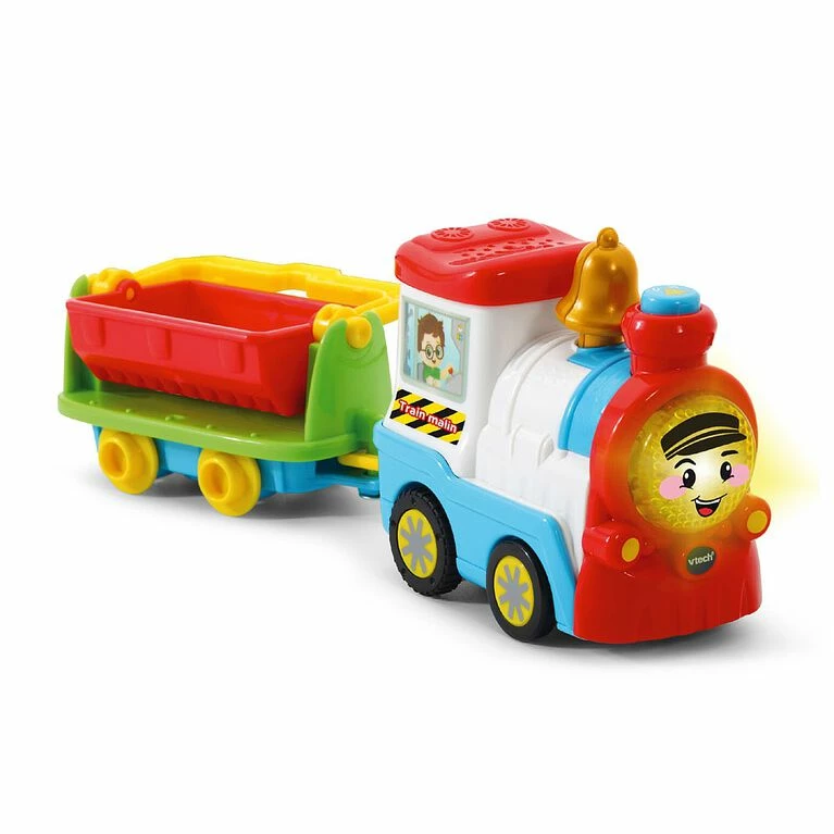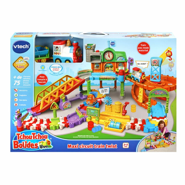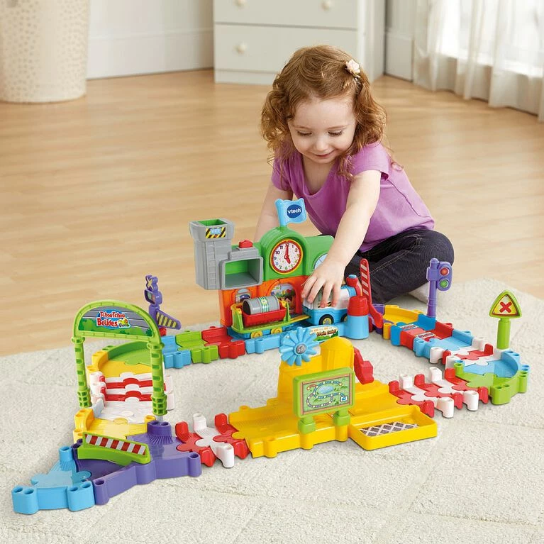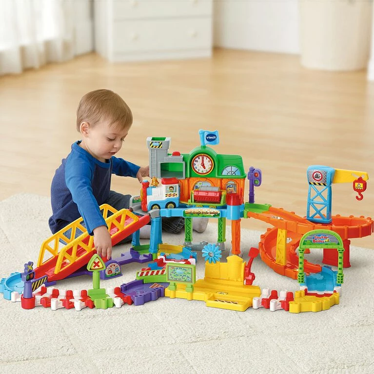 All aboard for loads of fun with the Go! Go! Smart Wheels Roadmaster Train Set. There are so many ways to play! Bendable tracks allow multiple configurations, and four SmartPoint locations and mechanical switches keep kids engaged. Choo-choo along with the motorized Freight Train with the detachable cargo car to haul the water drum from the station. Franklin the Freight Train powers himself up and down the ramp and the teeter totter bridge for multilevel play. Lift the cargo basket with the water drum once Franklin reaches the crane, then send the train back to the water depot. Enjoy trainmaster, role-play fun! Intended for ages 1-5 years. Requires 3 AAA batteries. Batteries included for demo purposes only, new batteries recommended for regular use.