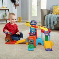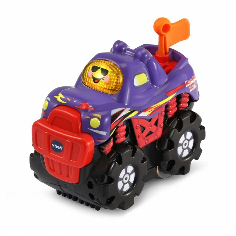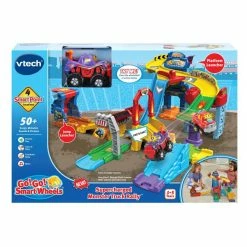 It’s showtime! Rush full-throttle down the tracks of the Go! Go! Smart Wheels Supercharged Monster Truck Rally with Miles the Monster Truck. Build an extreme monster truck race course complete with two launchers, a switch track, drawbridge and more. Place Miles the Monster Truck at the top of the two-story track and lift the launcher to watch him race through the course and catch air off the ramp. Use the jump ramp launcher to send Miles soaring over the drawbridge. Push the action button on Miles to move his flag while building fine motor skills. Press his windshield button to learn about the letter “M” and to hear sing-along songs and melodies. Includes four SmartPoint locations that trigger 50+ songs, melodies, sounds and phrases while reinforcing cause-and-effect learning. Hear his engine roar! Additional SmartPoint vehicles sold separately. Intended for ages 1-5 years. Requires 2 AAA batteries. Batteries included for demo purposes only. New batteries recommended for regular use.