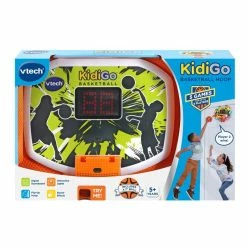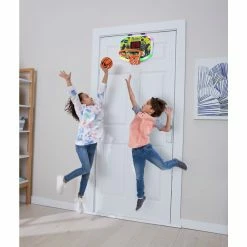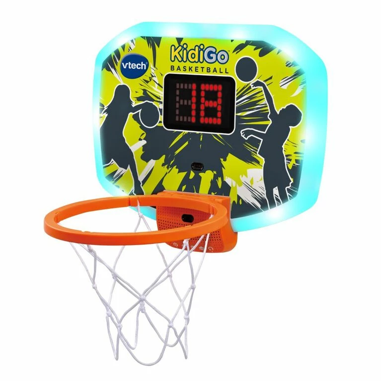 It’s game on with the KidiGo Basketball Hoop and ball! An interactive scoreboard keeps score and cheers you on, celebrating each basket with lights and sounds. Five game modes offer options to play solo or with up to five players with four built-in games, or make up your own rules in Free Play. Play solo in Color Challenge, timing your shot with the colored scoreboard lights, or make the game-winning basket before time runs out in Time Challenge. Now it’s team time! Gather up to four other players or play solo in Score Challenge, sinking as many shots as you can in one minute. Include friends and family in a Hot Potato game. Quick! Make a basket and pass the ball before the music stops. When play is done, flip up the hoop for easy storage. Backboard attaches over most doors with included padded door hooks, or can be mounted with the backboard holes. Mounting hardware is not included. Intended for ages 5+ years. Requires 4 AA batteries. Batteries included for demo purposes only. New batteries recommended for regular use.