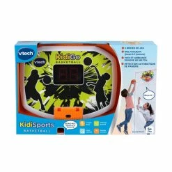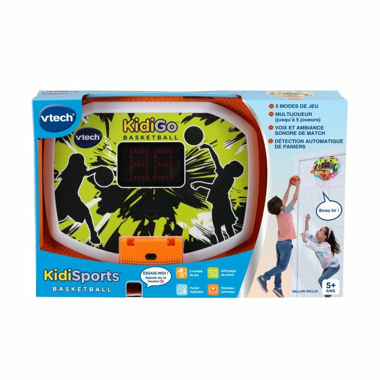 It’s game on with the KidiGo Basketball Hoop and ball! An interactive scoreboard keeps score and cheers you on, celebrating each basket with lights and sounds. Five game modes offer options to play solo or with up to five players with four built-in games, or make up your own rules in Free Play. Play solo in Color Challenge, timing your shot with the colored scoreboard lights, or make the game-winning basket before time runs out in Time Challenge. Now it’s team time! Gather up to four other players or play solo in Score Challenge, sinking as many shots as you can in one minute. Include friends and family in a Hot Potato game. Quick! Make a basket and pass the ball before the music stops. When play is done, flip up the hoop for easy storage. Backboard attaches over most doors with included padded door hooks, or can be mounted with the backboard holes. Mounting hardware is not included. Intended for ages 5+ years. Requires 4 AA batteries. Batteries included for demo purposes only. New batteries recommended for regular use.
