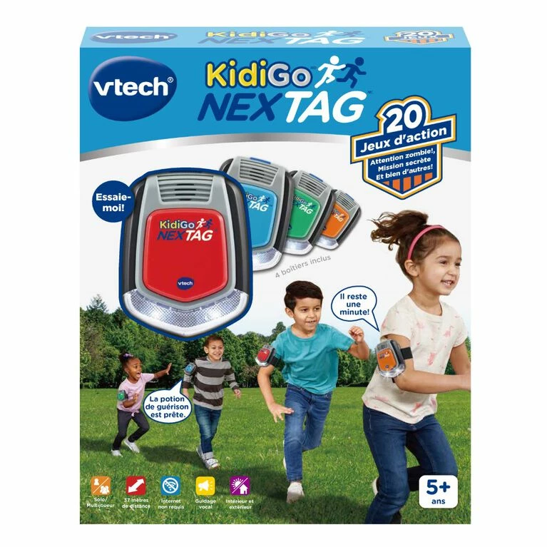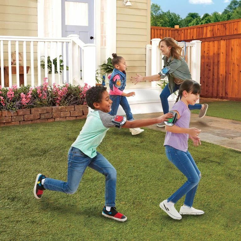 Outdoor play just got an upgrade! KidiGo NexTag is WAY more than just tag – it’s a high-tech spin on 20 different backyard games including capture the flag, freeze tag and hide-and-seek. There’s no internet needed to play – all you need are the four included electronic units and adjustable arm bands! A friendly voice explains the quick and easy-to-learn rules so kids can start playing fast. No referee required – the game lets you know who’s it and who won. There’s one- and two-player games or the WHOLE family can get in on the fun. Go from four to eight players by combining two KidiGo NexTag systems (sold separately). Play indoors or out with a 120-foot range between units. All you have to do is press the big button and tag, you’re it! Intended for ages 5+ years. Requires 8 AA batteries, 2 per unit. Batteries included only in red unit for demo purposes. New batteries recommended for regular use.