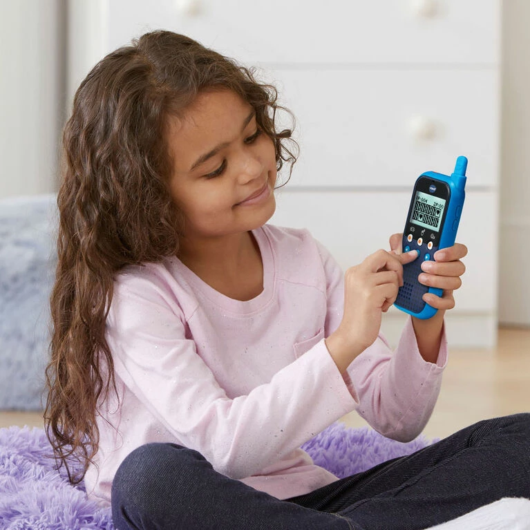 Add excitement to any adventure with the KidiGo Walkie Talkies. Keep in touch anywhere with an awesome 650-foot range! These kid-safe, two-way radios feature a digital connection that’s clear and keeps kids’ conversations secure, preventing other walkie-talkie users from listening in or chatting with them. Little adventurers can also send messages back and forth by choosing from preset animated messages using the large, backlit LCD screen. The walkie talkies also include four two-player games for real-time gaming between devices. Intended for ages 4+ years. Requires 6 AAA batteries. Batteries included for demo purposes only, new batteries recommended for regular use.