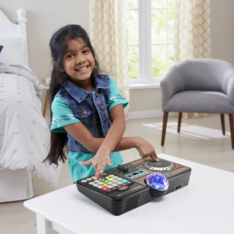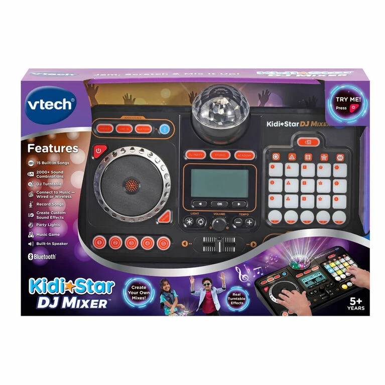 Be the star of the show with the KidiStar DJ Mixer! Scratch and jam to the music on the DJ turntable. Create custom mixes playing along with the 15 included songs or connect to your own music player, via BLUETOOTH wireless technology or audio cable. Play with the sound grid to create 2000+ sound combinations! Record your own custom sound effects and tags with the internal mic. Dial in the effects with the sliders to get your remix just right. Add and remove vocals and effects, fine tune the mix, and record your mash-up. Use the headphone jack to listen, or play back your tracks for all your fans to hear through the built-in speaker. Get the crowd going with dazzling party lights on your DJ rig. Build your DJ skills by following the rhythms in a music game. Crank up the volume and get the party started! (Audio cable, headphones and external music player not included.) Intended for ages 5+ years. Requires 4 AA batteries. Batteries included for demo purposes only. New batteries recommended for regular use.