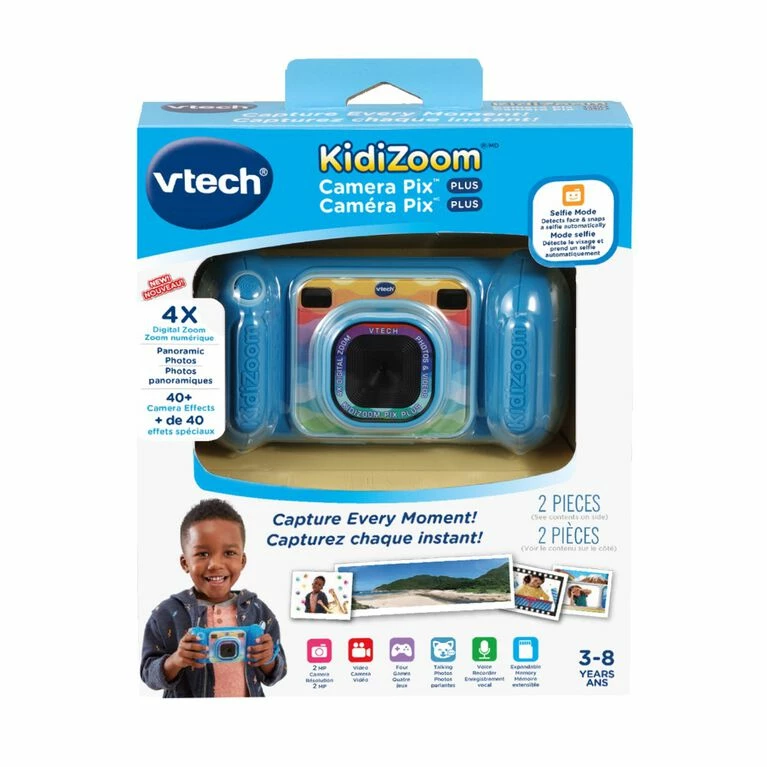 Focus on fabulous photos with the KidiZoom Camera Pix Plus! Inspire curiosity with creativity tools and 40+ camera effects on this 2.0 megapixel camera with 4X digital zoom and 1.8″ screen. Create a Talking Photo using your own voice and photo. Apply voice-changing effects, then play it back-your photo appears to talk! In Photo Editor mode, add photo frames, stamps and more. Create a kaleidoscope, a photo collage, or make a video with loads of special effects. Expand your creativity with Panorama mode. Create a panoramic shot by stitching together two to five images. Experiment with Animation Maker and combine up to 100 photos with image overlay technology to create your very own animation. Ready to switch gears? Relax with four built-in games. Have fun with Recycle Rescue, Delivery Dash, Fast Flowers and Gift Tower. This rugged, kid-friendly camera with wrist strap is easy for little photographers to grip and hold. Expand the camera memory up to 32GB, and transfer files to a computer to save them (memory card and USB cable not included). Intended for ages 3-8 years. Requires 4 AA batteries. Batteries not included.