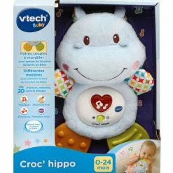 Soothe sore gums with an adorable hippo friend. The Lil’ Critters Huggable Hippo Teether by VTech is a soft plush hippo with two textured teethers to help soothe and massage gums. Press the light-up heart button to hear more than 30 fun phrases, melodies and sing-along songs. The plush teether features a variety of textures, including crinkle fabric, that provides sensory stimulation. Removable electronics allow the teether to be easily cleaned. The soft hippo is easy to grasp and is perfectly sized for little hands or on-the-go fun.