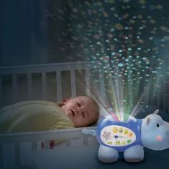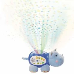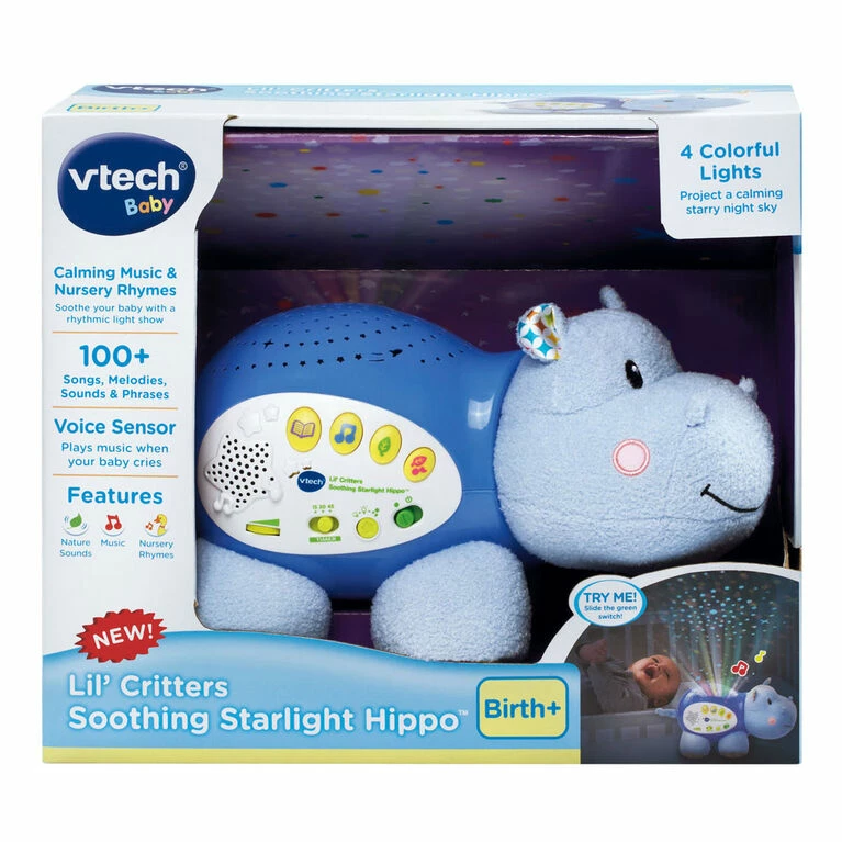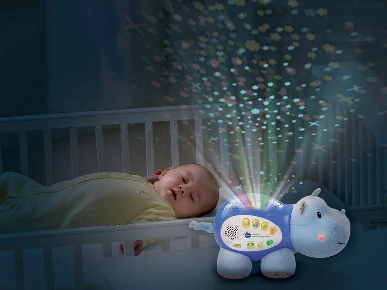 Sweet dreams are ahead with the Lil’ Critters Soothing Starlight Hippo by VTech. This cuddly hippo projects a vibrant starry night sky onto the ceiling in four different colors to the sounds of peaceful tunes, seven nursery rhymes, nature sounds and lullabies. Colorful light effects enhance visual awareness, while the comforting sounds and songs help soothe them to sleep. This helpful hippo also responds to your baby’s cries with calming music. The parent-friendly volume and timer controls let you choose how loud and long the sounds play. Sleep tight, little one!