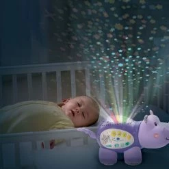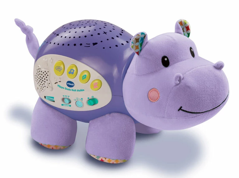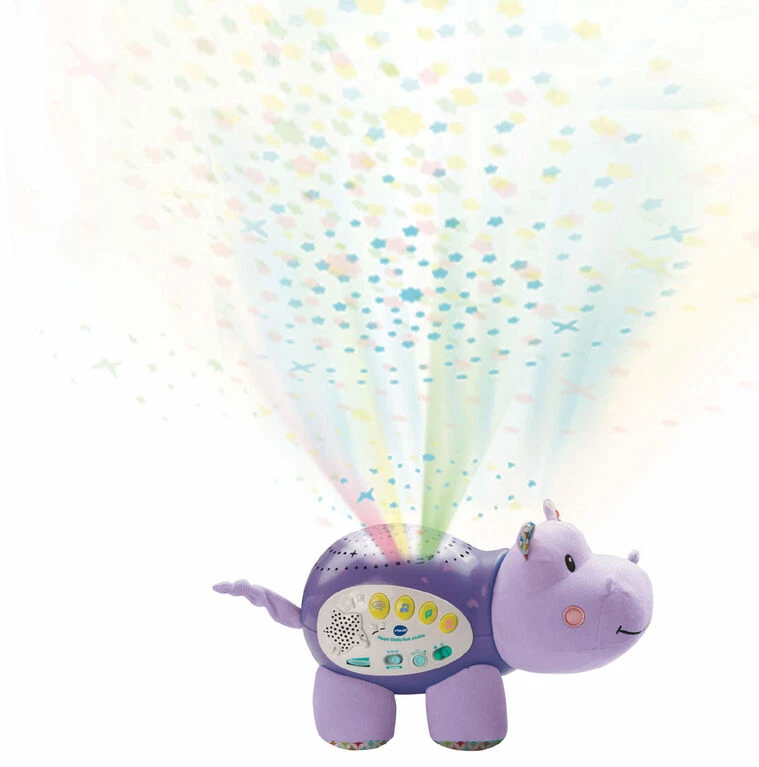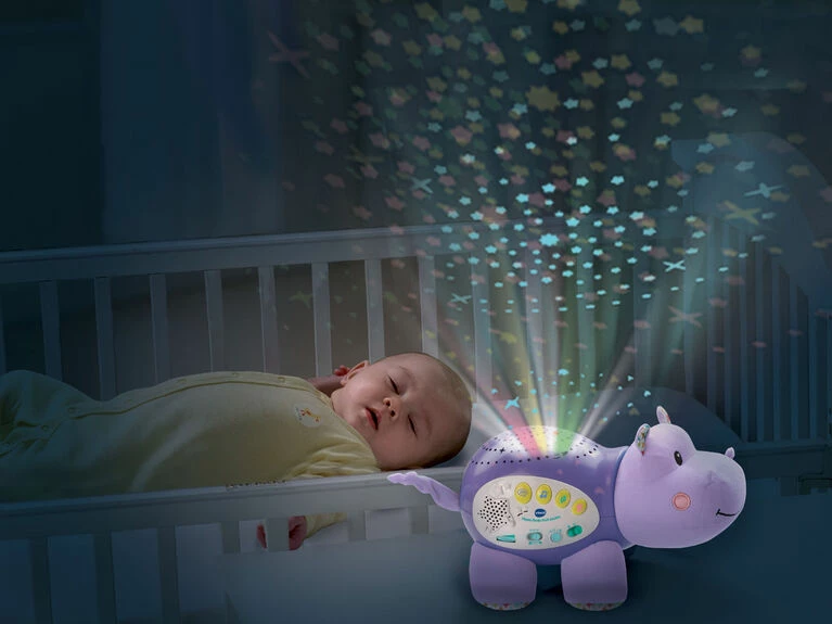 Sweet dreams are ahead with the Lil’ Critters Soothing Starlight Hippo by VTech. This cuddly hippo projects a vibrant starry night sky onto the ceiling in four different colors to the sounds of peaceful tunes, seven nursery rhymes, nature sounds and lullabies. Colorful light effects enhance visual awareness, while the comforting sounds and songs help soothe them to sleep. This helpful hippo also responds to your baby’s cries with calming music. The parent-friendly volume and timer controls let you choose how loud and long the sounds play. Sleep tight, little one!