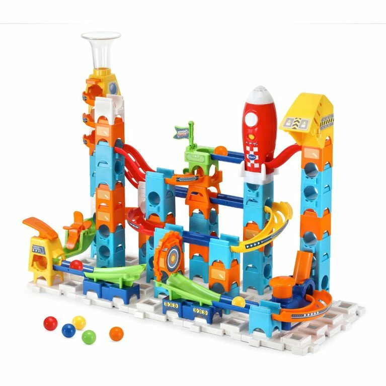 Build thrilling stunts, exciting challenges and watch marbles take off with the Marble Rush Launchpad Set. This 89-piece color-coded building set includes a musical light-show rocket ship, thrilling ramps, fast tracks, extreme launchers and bases that all easily connect together. The easy-to-follow leveled guide includes three different builds from beginner to advanced, or create your own courses. When construction is complete, drop the 10 marbles into action and watch them race down ramps to the launcher and jump challenges. Compete with family and friends using the exciting launchers to keep the marbles in motion and bring them back to the beginning. Combine with other Marble Rush sets (sold separately) to create an extreme playset. Find more build ideas by visiting the VTech Kids website. Recipient of the STEAM (Science, Technology, Engineering, Art and Math) Accreditation Stamp of Approval by the Toy Association. Intended for ages 4+ years. Requires 2 AA batteries. Batteries included for demo purposes only. New batteries recommended for regular use.