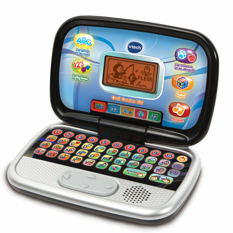 Little learners can get a smart start with the Ordi Genius Kid. Five categories of leveled learning offer 20 activities plus an All About You section to let kids personalize their laptop. Start with Letters and Words with eight activities that reinforce letters, letter sounds, spelling and letter order. In Numbers and Shapes, eight games and activities include counting, skip counting and number order. Other play activities are Animals and Foods, Logic and Games, and Music Time. A friendly penguin is your child’s companion as they explore all the laptop has to offer. This sleek, black toy laptop has a 26-letter keyboard with 10 number keys as they play games and activities. Intended for ages 3-6 years. Requires 2 AA batteries. Batteries included for demo purposes only. New batteries recommended for regular use.
