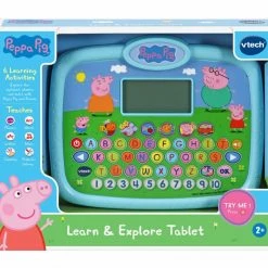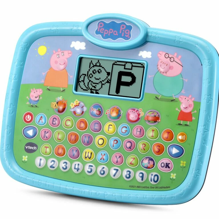 It’s time to play and learn with Peppa Pig, her family and friends on the Peppa Pig Learn and Explore Tablet. Six interactive activities teach language, counting, problem-solving and more with animated characters and character voices from the show Peppa Pig. Help Emily Elephant count the stars, press a letter to see what object Peppa Pig has drawn, or learn about letters, phonics and numbers with Mr. Fox. Time for a music party with Candy Cat! Add playful sound effects to the melodies. Next, play hide-and-seek with favorite Peppa Pig characters. Then help Daddy Pig splash through muddy puddles to get to the family’s picnic spot. The 26-letter keyboard and ten number keys help preschoolers learn about the alphabet, phonics, counting and vocabulary words. Four touch-sensitive character buttons play the characters’ favorite sayings in their own voices. Oinktastic! Intended for ages 2+ years. Requires 2 AA batteries. Batteries included for demo purposes only. New batteries recommended for regular use.