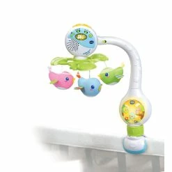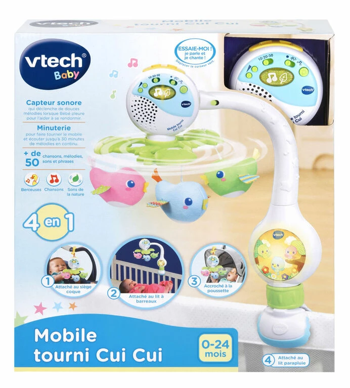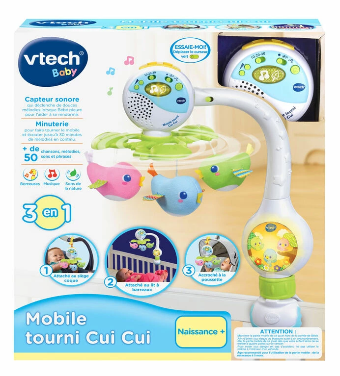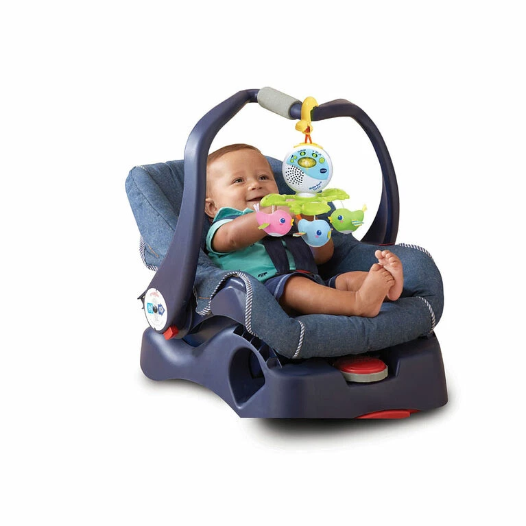 Help your baby drift off to sleep with the Soothing Songbirds Travel Mobile. This 3-in-1 mobile transforms from a crib mobile and calming night-light to a travel mobile that can be attached to infant carriers and strollers. Three adorable plush songbirds twirl around, mesmerizing your baby and encouraging visual interaction. The voice sensor detects your baby’s cry and responds with soothing melodies to lull your little one back to sleep when in the crib. The mobile plays relaxing music, nature sounds and soothing songs and the timer can be set for 10, 20 or 30 minutes. From sweet dreams to on-the-go play, this mobile will soothe and engage your little one at home or away. Intended for ages birth+. Requires 3 AA batteries. Batteries included for demo purposes only, new batteries recommended for regular use.