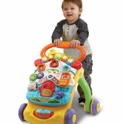 Sit, crawl, walk-the milestones keep coming, and we’re here for the journey! When your baby gets ready to walk, you’ll want stability and speed control. This toy has both. A wide base and two wheel speeds give you peace of mind and help your baby feel confident taking their first steps, on bare floors or carpet. Sit on the floor to play with the removable activity panel, or take it on the go. There’s so much to discover! Hear music and first words about colors with five light-up piano keys. Babies can spin gears and rollers, press piano keys and pick up and carry a play phone, helping their little hands and fingers get stronger. Put shapes into their slots to explore shapes and numbers. When your little one is ready to walk, place the panel back on the walker! The chunky handle is easy to grab, and the motion sensor rewards baby’s steps with playful music. Get in stride with an interactive activity walker that’s tough enough for years of play. Legs fold to easily tuck walker away. Intended for ages 9-36 months. Requires 2 AA batteries. Batteries included for demo purposes only. New batteries recommended for regular use.