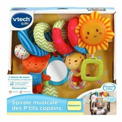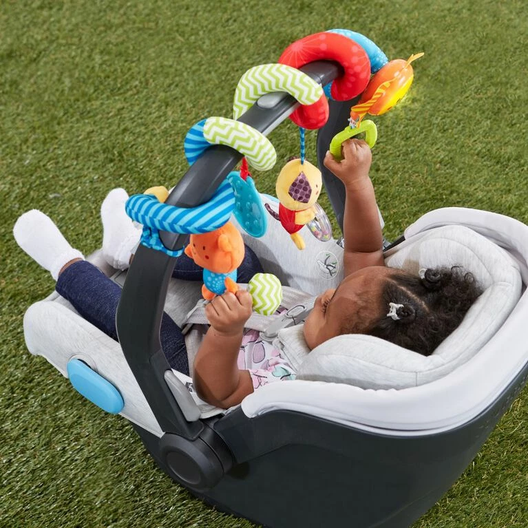 Bring the sun with you wherever you go! The Sunny Days Activity Spiral packs a smiling sun and four dangling accessories into a portable, bendable electronic toy. Wrap it around the bar of an infant carrier or a stroller to help your baby stay entertained on the go. Push the smiling, light-up sun to hear songs and phrases. Dangling toys encourage little ones to reach, grab, bat and push! When babies pull on the easy-to grasp square handle, they are rewarded with sounds and songs. The soft puppy invites exploration with a spinning rattle, and the soft kitty includes a surprise squeaker inside. Multiple textures, colors and patterns help babies develop their senses of sight and touch. A baby-safe mirror helps little ones along in their journey of self-discovery. Fill every day with sunshine with this take-along activity spiral. Intended for ages birth to 24 months. Requires 1 AAA battery. Battery included for demo purposes only. New battery recommended for regular use.
