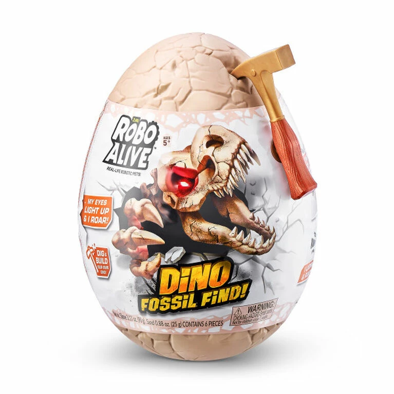 Join the adventure with Robo Alive Dino Fossil Find! Dig through rock, sand, and slime using the excavation tool to find 1 of 4 dinosaur fossils. Have you discovered the fearsome T-Rex, terrifying Triceratops, awesome Ankylosaurus or the striking Stegosaurs? Assemble the fossil pieces to bring your dinosaur skeleton to life! With light up eyes and realistic dinosaur roars, these Dino fossils are like nothing you’ve seen before. Which prehistoric dinosaur will you find? Please Note: Colours and styles may vary. Style selected at random by warehouse during time of shipment.
