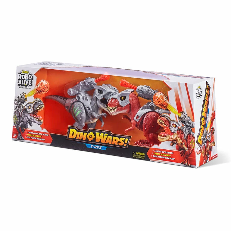 Get ready for an epic Dino battle! ZURU’s new Robo Alive Dino Wars T-Rex’s are built with advanced robotic technology and come complete with real firing weapons! With lifelike roars and realistic dinosaur movement, these T-Rex’s are no ordinary pets. Strap on the defensive armor, load up the Dino Blaster, and battle. The red T-Rex’s eyes even light up so it can hunt in the dark. It’s more than alive, It’s Robo Alive!