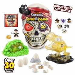 Smash your way to an epic prehistoric adventure with Smashers Dino Island Giant Skull. SMASH your skull to smithereens to uncover the 30 hidden surprises inside this action-packed skull! Search through cotton candy foam and super stretchy slime for your dino pieces! Along the way, look out for a pesky pirate figurine and 5 epic smashers mini eggs that hold all new mini characters! You’ll also discover the Golden Dino Skull pencil topper and 6 Smashers stickers amongst your Dino Island treasure. Construct your dino parts before placing the Giant Skull eye inside your dino’s mouth to listen to it ROAR. There are two prehistoric beasts and over 20 mini characters to smash and collect! Will you find the mighty T-Rex or the prehistoric Megalodon shark!? What arrrgh ye waiting for! Get smashing to discover your new dangerously epic Smashers Dino! Please Note: Colours and styles may vary. Style selected at random by warehouse during time of shipment.